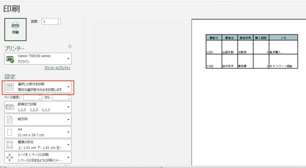1. 印刷したい範囲を選択